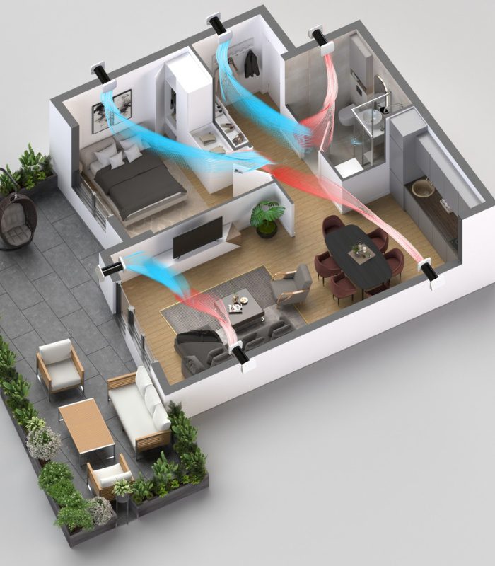 Taip sukuriamas subalansuotas oro judėjimas tarp patalpų ir paprasta, bet efektyvi zoninė vėdinimo sistema be sudėtingų ortakių ir brangios centrinės rekuperacijos.
