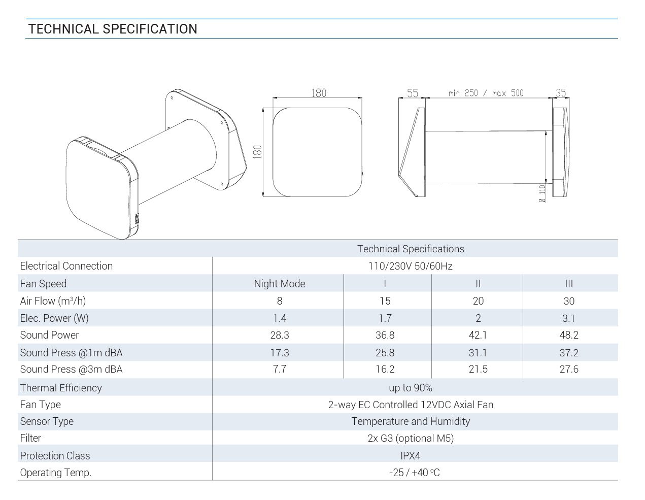 - Oro srautai: 8 / 15 / 20 / 30 m³/h (naktinis + 3 greičiai)